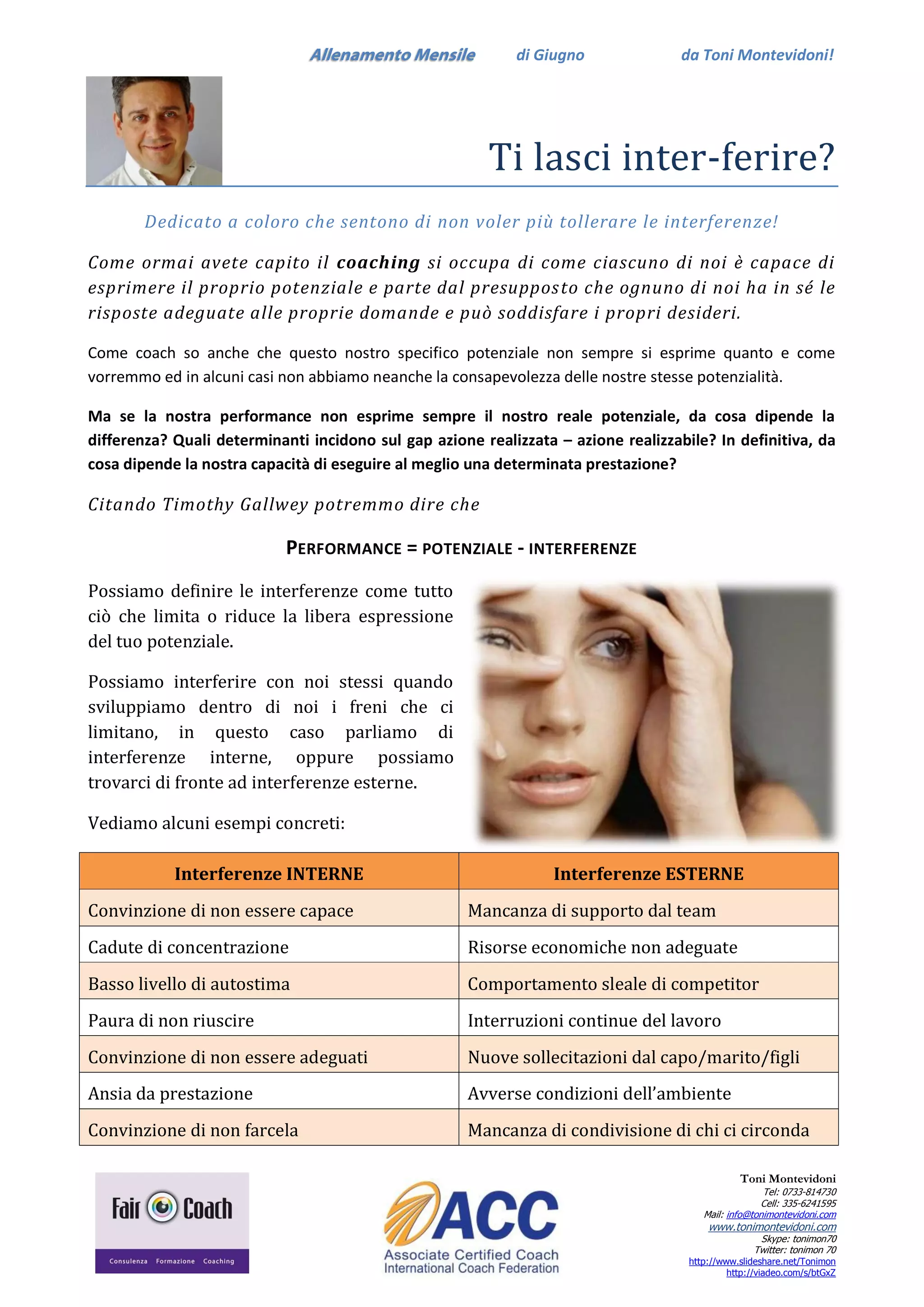 Il documento riguarda un allenamento mensile di giugno condotto da Toni Montevidoni, incentrato sul superamento delle interferenze che limitano l'espressione del potenziale individuale. Vengono distinte due tipologie di interferenze: interne ed esterne, fornendo esempi concreti di ciascuna. Inoltre, viene proposto un esercizio pratico per aiutare a identificare e ridurre le interferenze nel proprio comportamento personale e lavorativo.