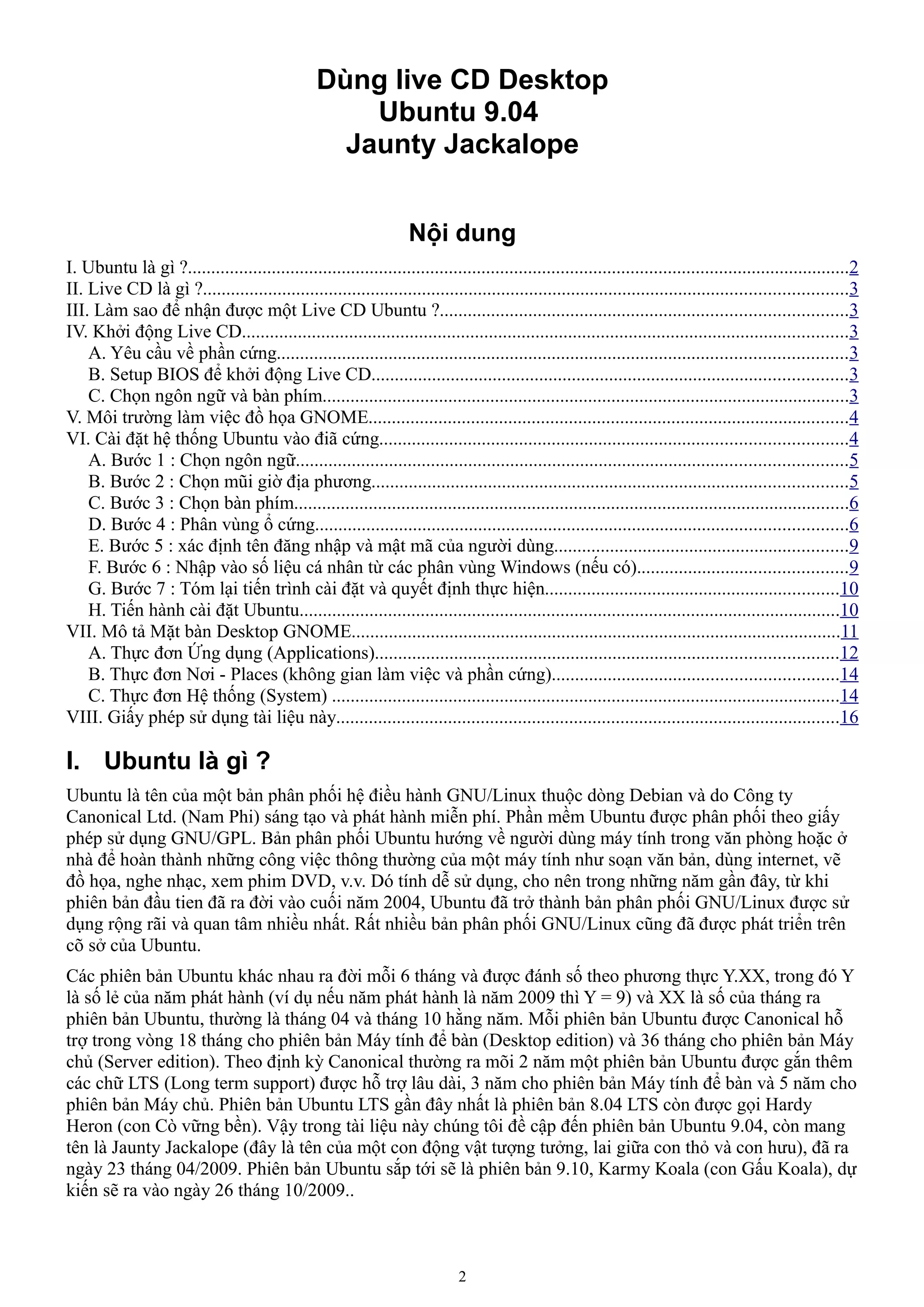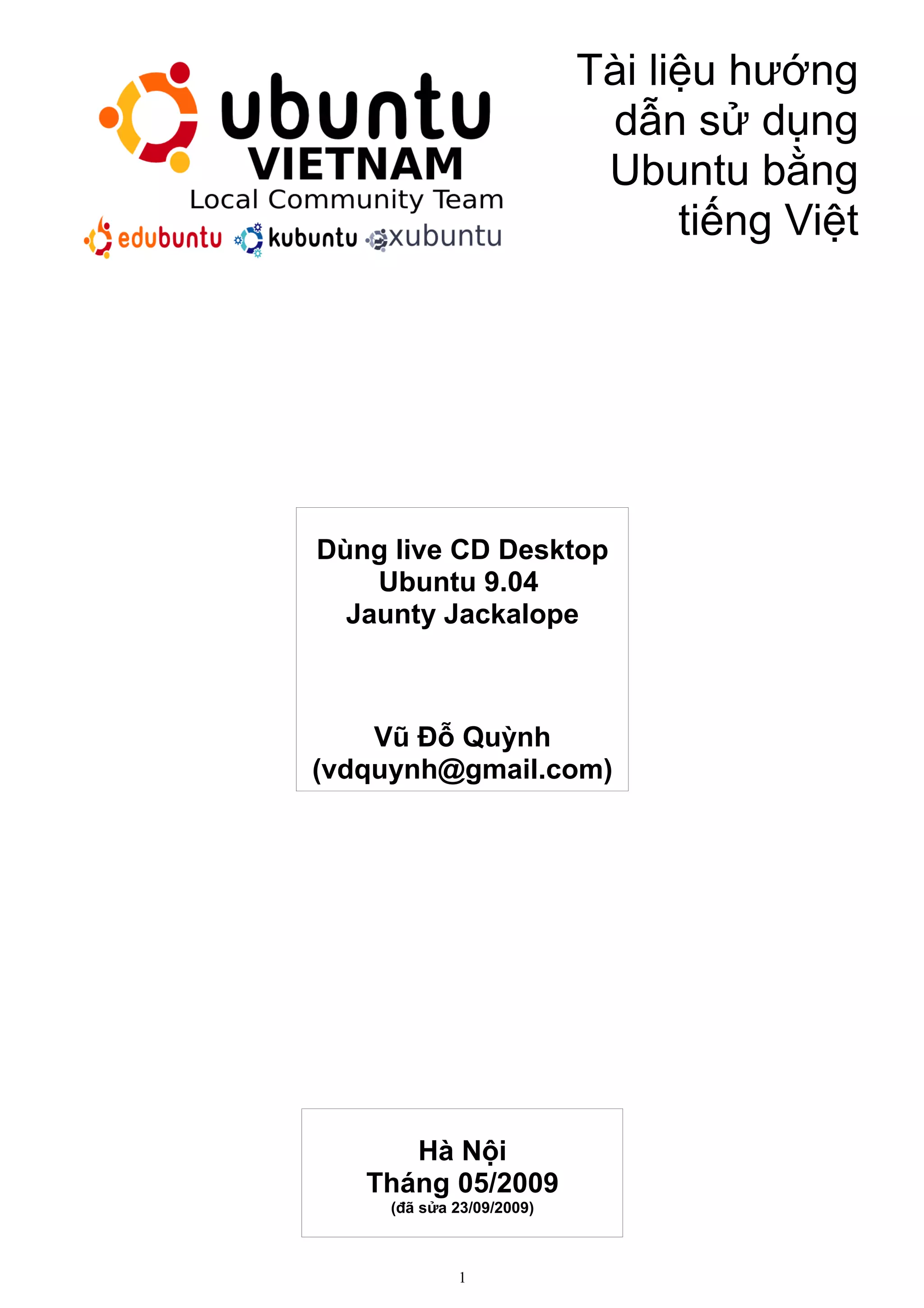 Tài liệu hướng dẫn sử dụng Ubuntu 9.04 Jaunty Jackalope, bao gồm các nội dung chính như giới thiệu Ubuntu, Live CD, hướng dẫn khởi động và cài đặt hệ thống. Nó cung cấp thông tin chi tiết về yêu cầu phần cứng, môi trường làm việc GNOME, và quá trình cài đặt từ phân vùng ổ cứng đến xác định tên người dùng và mật khẩu. Tài liệu cũng hướng dẫn cách nhận Live CD và dành cho người dùng máy tính văn phòng hoặc gia đình.