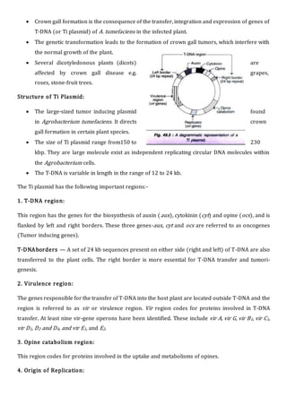 The document summarizes key information about Ti plasmids, which are plasmids found in Agrobacterium tumefaciens that cause crown gall disease in plants. The Ti plasmid transfers a segment of DNA called T-DNA into the host plant genome, integrating genes that cause tumor formation. The plasmid has regions for T-DNA, virulence genes needed for transfer, and sometimes opine catabolism genes. Ti plasmids are used to create transgenic plants by replacing the tumor genes with a gene of interest in the T-DNA.