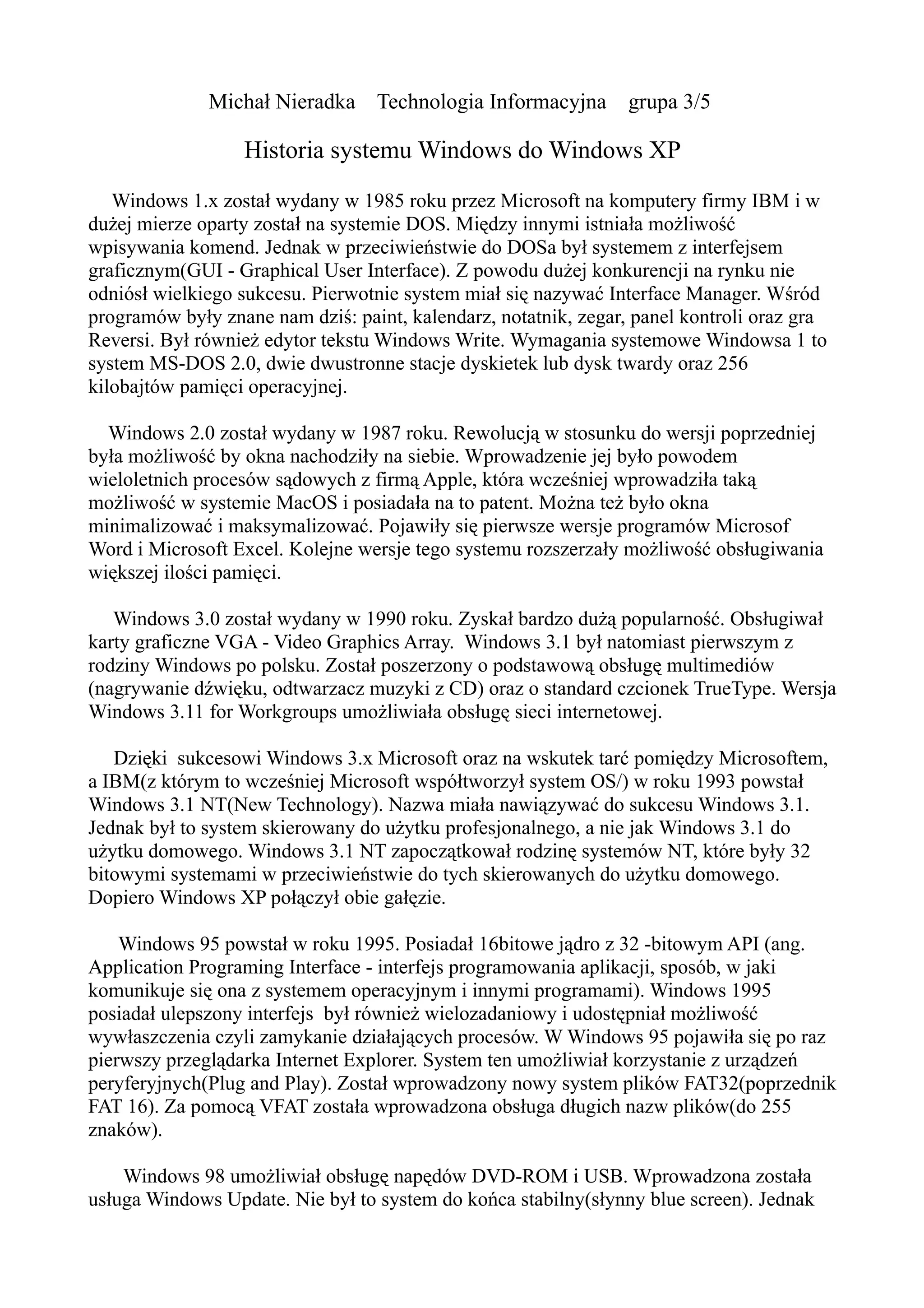 użytku domowego. Windows 3.1 NT zapoczątkował rodzinę systemów NT, które były 32