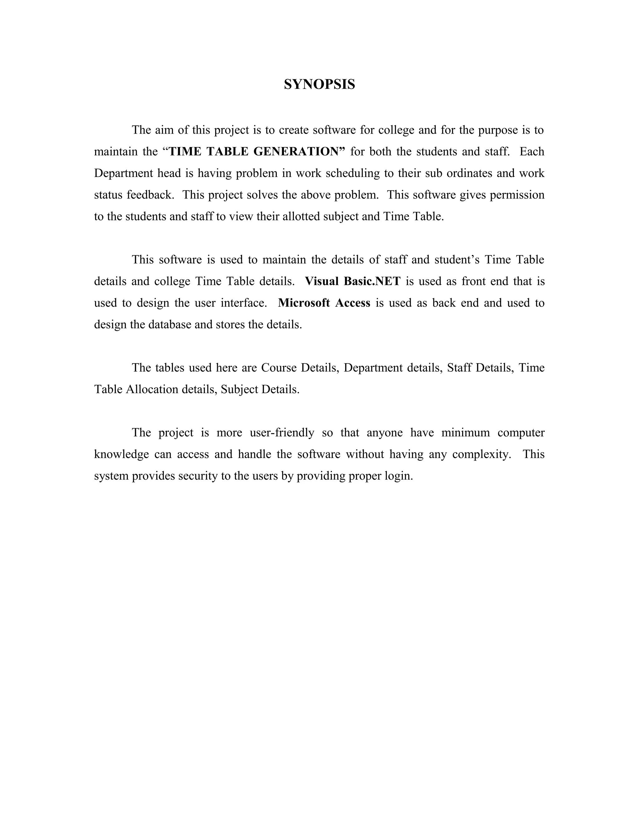 This software aims to create a time table generation system for a college to manage student and staff schedules. It allows department heads to view work status and allows students and staff to view their assigned subjects and timetables. The software stores details of students, staff, courses, departments, and timetables in a backend Microsoft Access database using a Visual Basic.NET frontend for the user interface. It provides a more user-friendly system than the previous manual process to generate and manage schedules.