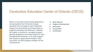 The document summarizes Vania Norman and Caitlin London's service learning project at the Conductive Education Center of Orlando (CECO). CECO is a school that serves students ages 18 months through adulthood with neurological motor disabilities. For their project, Vania and Caitlin designed an art project to incorporate into CECO's summer camp program. Over two days, they learned about CECO's programs, met with staff and students, read a book on Independence Day to students, and led an art project where students made Uncle Sam masks. They observed that CECO provides specialized, compassionate care and that the students were witty, bright, and knowledgeable.
