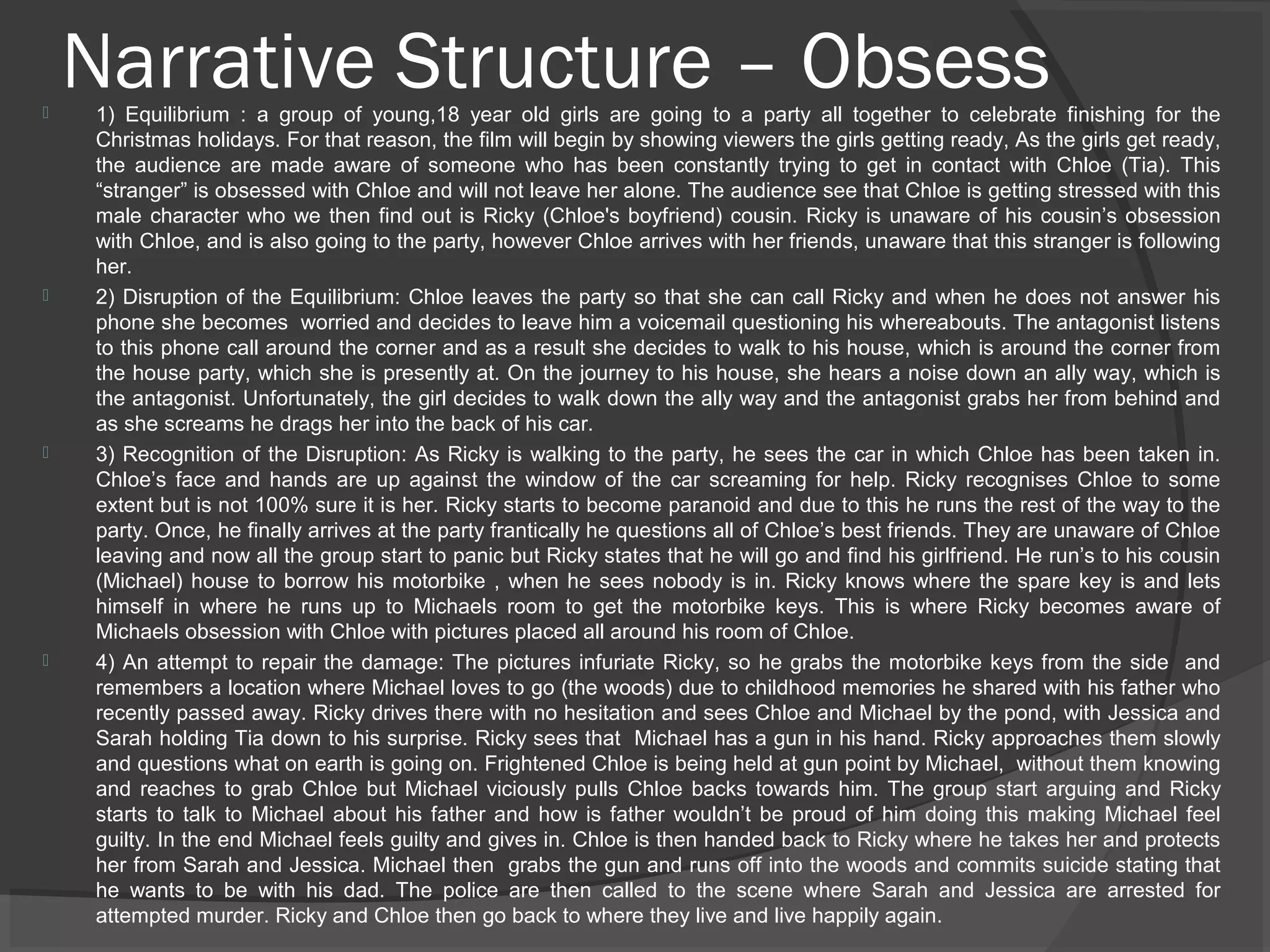1) A group of 18-year-old girls get ready for a party to celebrate the holidays, unaware that one of their friends, Chloe, is being stalked by Ricky's cousin.