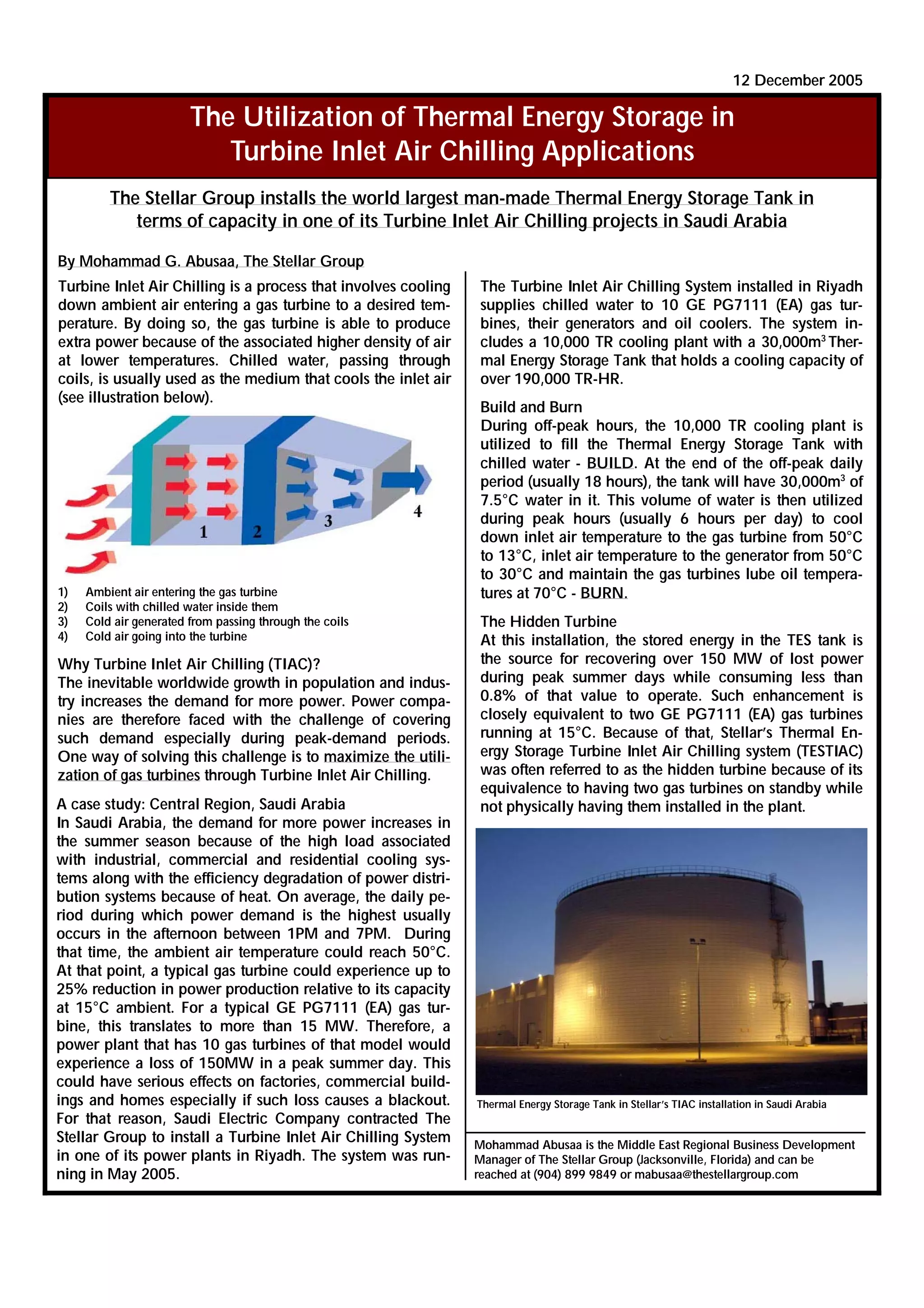 The document discusses a turbine inlet air chilling project in Saudi Arabia that installed the world's largest thermal energy storage tank in terms of capacity. The project uses a 10,000 ton refrigeration cooling plant and 30,000 cubic meter thermal energy storage tank to chill inlet air for 10 gas turbines. During off-peak hours, the cooling plant fills the tank with chilled water, and during peak hours this stored chilled water is used to cool inlet air and recover over 150 MW of lost power production. This thermal energy storage system is described as the equivalent of having two additional gas turbines without needing to install physical turbines.