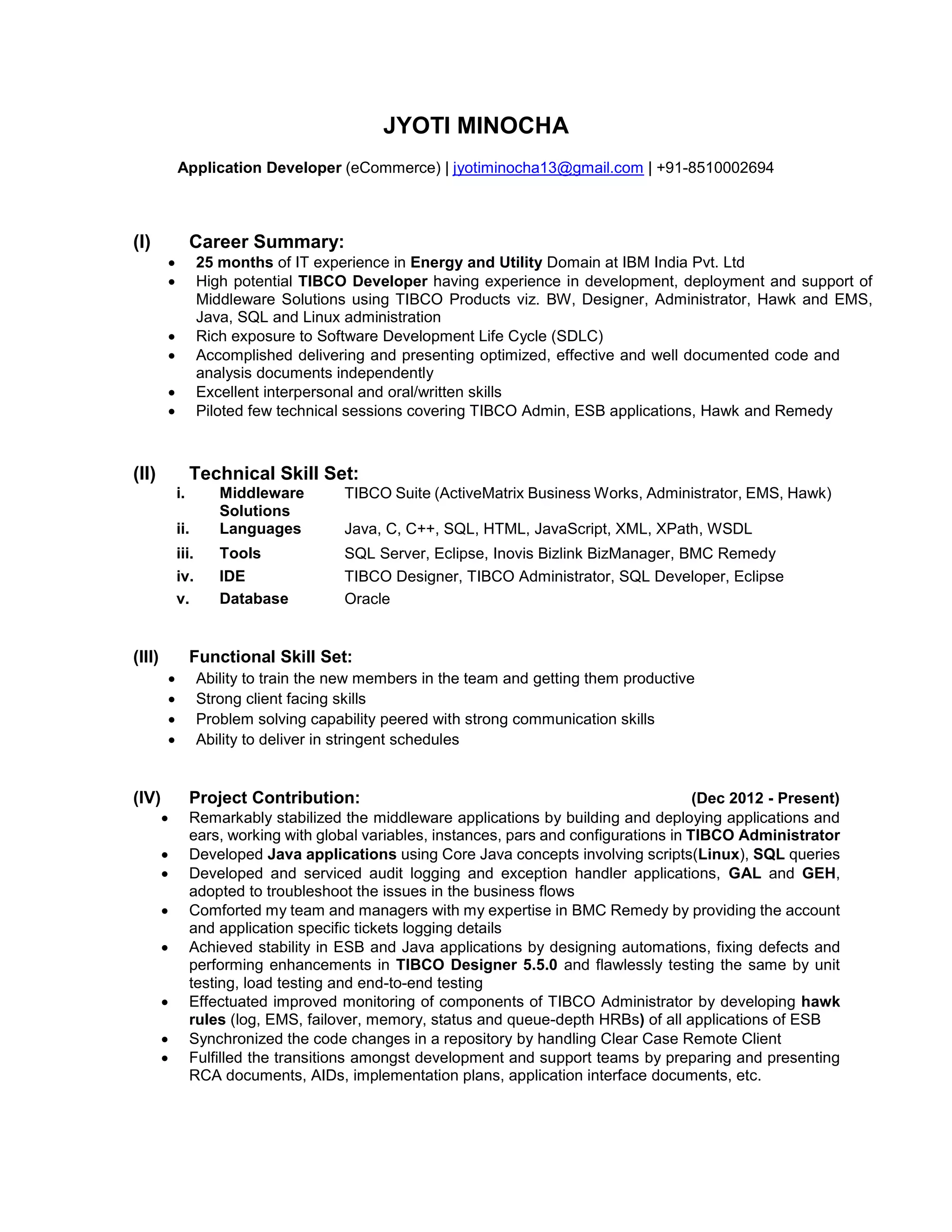 Jyoti Minocha has over 25 months of experience as an Application Developer at IBM India Pvt. Ltd. She has expertise in middleware technologies like TIBCO and skills in languages such as Java, SQL, and XML. She has experience developing, deploying, and supporting middleware solutions. She also has strong client facing and problem solving skills.