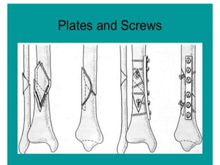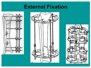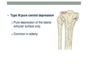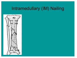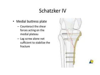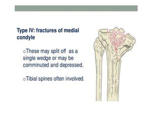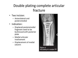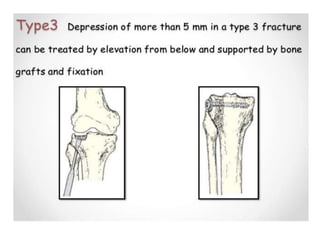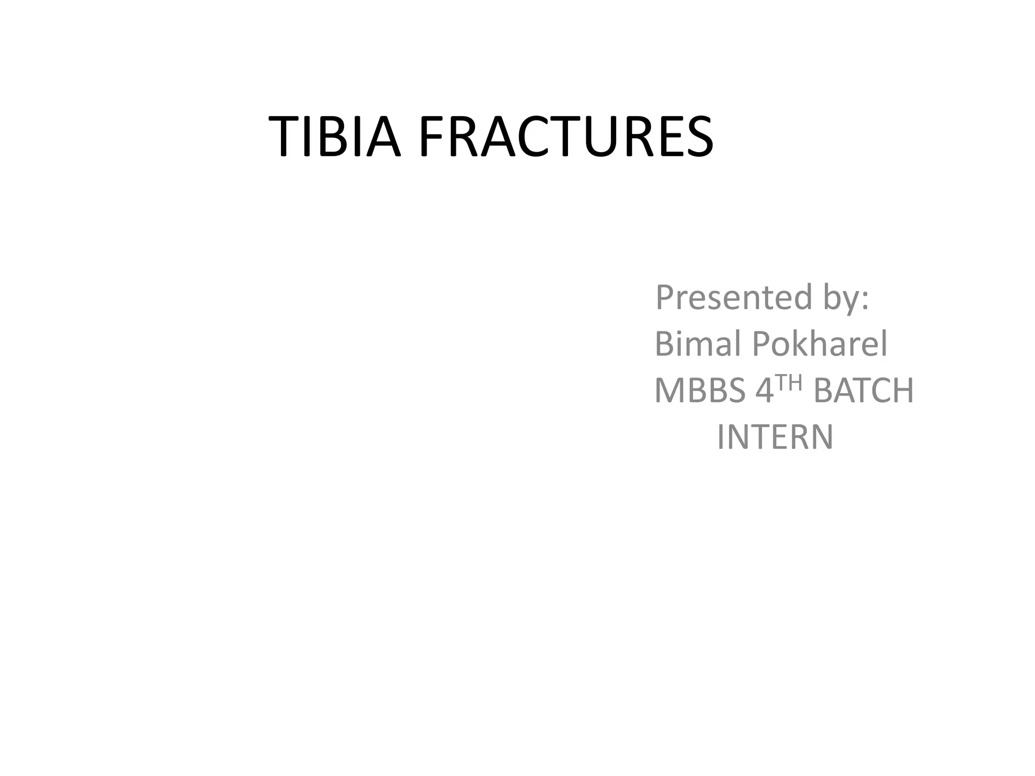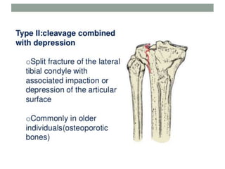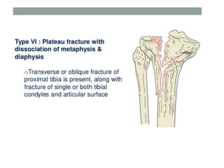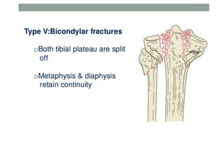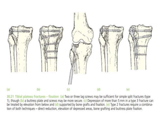 Tibial fractures can occur in the tibial plateau or tibial shaft. Tibial plateau fractures comprise 1% of all fractures and are usually caused by high-energy injuries involving axial loading and valgus/varus forces on the knee. They are often associated with soft tissue injuries. Tibial shaft fractures are commonly caused by direct trauma from motor vehicle accidents and may be open or closed fractures. Treatment depends on the fracture type but commonly involves internal fixation methods like intramedullary nailing or plating. Complications can include malunion, delayed healing, and infections.