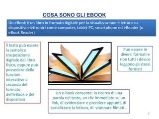 Il documento discute l'uso degli ebook e delle tecnologie dell'informazione e comunicazione (TIC) nella didattica, evidenziando vantaggi come la trasportabilità e l'adattabilità, ma anche limiti come l'affaticamento degli occhi. Viene analizzata la scelta dei formati degli ebook (epub, mobi, pdf) e le specifiche necessità tecniche per la lettura su vari dispositivi. Infine, si indicano applicazioni e risorse per la lettura, l'acquisto e il prestito digitale di ebook.