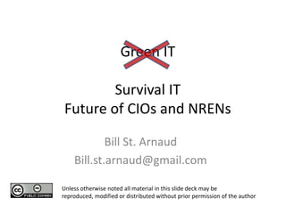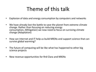 This document discusses how climate change poses an existential threat and how information and communication technologies (ICT) and networks can help societies adapt and survive. Rapid warming is already causing severe impacts like droughts and flooding that will disrupt energy systems and infrastructure. To adapt, networks must be designed to operate on renewable energy sources like wind and solar, even relocating facilities to remote locations with clean power. This represents an opportunity for innovation in areas like follow-the-sun computing across data centers. National research and education networks (NRENs) can act as cloud brokers to facilitate such distributed computing on green infrastructure.