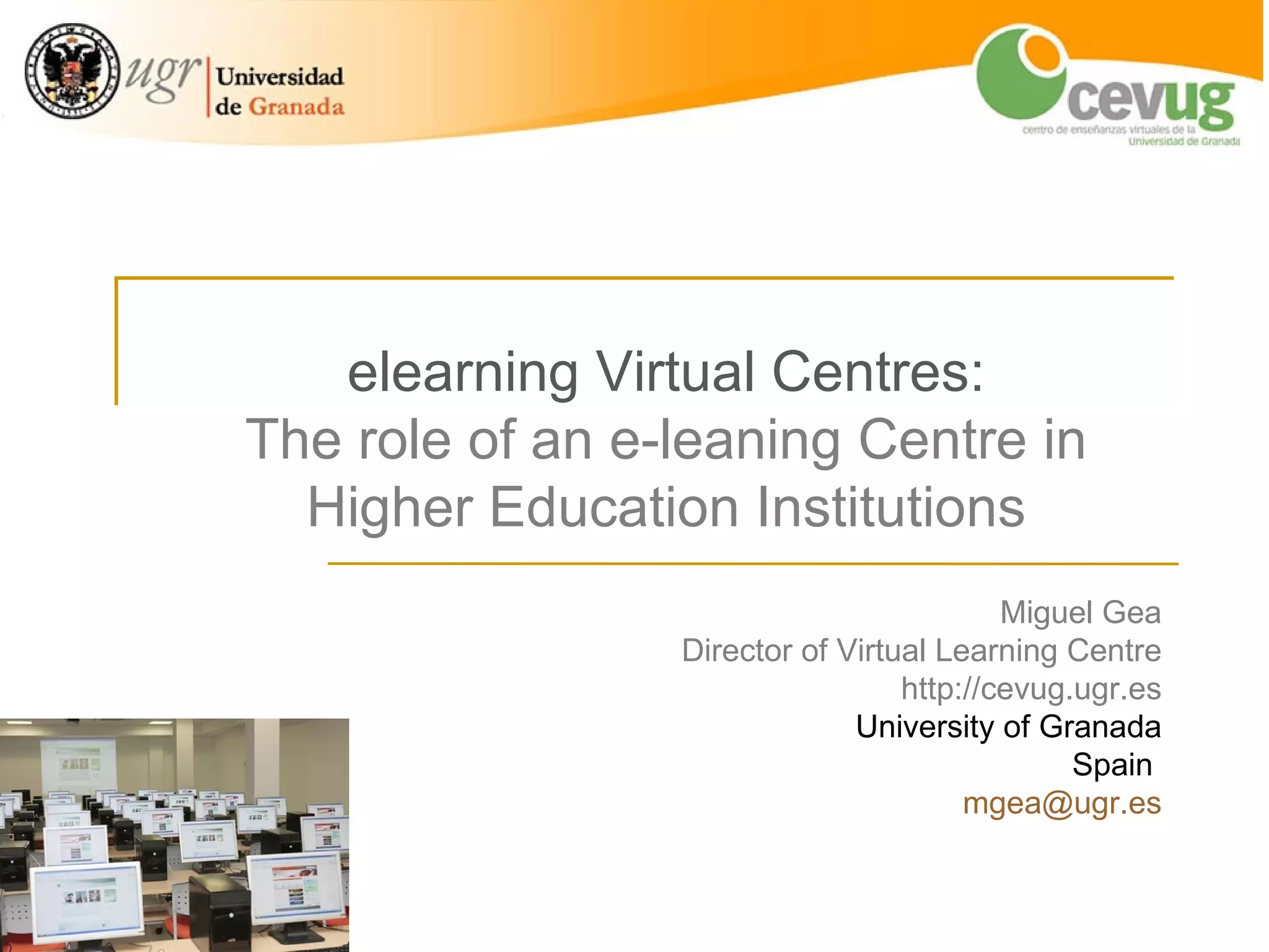 This document outlines the role of e-learning centers in higher education, emphasizing their importance in modern educational institutions amidst the transition from traditional to digital learning environments. It highlights trends in technology, challenges faced by institutions, and the necessity for innovative models to enhance accessibility and engagement. The text also discusses the impact of Open Educational Resources (OER) and the importance of collaboration and quality management in advancing e-learning initiatives.