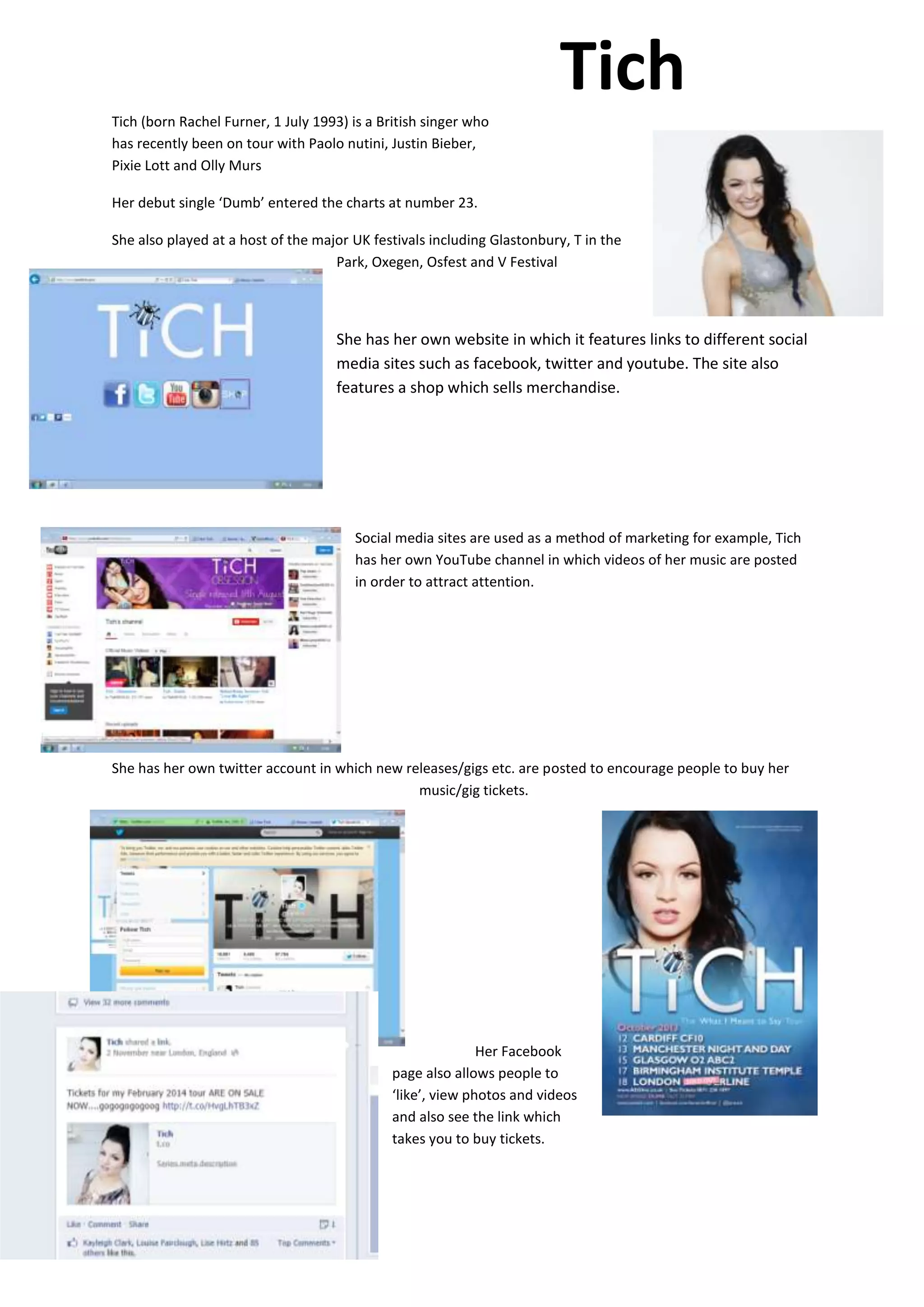 Tich is a British singer who has toured with several well-known artists. Her debut single "Dumb" reached number 23 on the charts. She has played at major UK music festivals and uses social media like Facebook, Twitter, and YouTube to promote her music and interact with fans, gaining over 2.5 million YouTube views and thousands of social media followers. Getting recognition from popular artists like One Direction has helped expand her profile and audience.