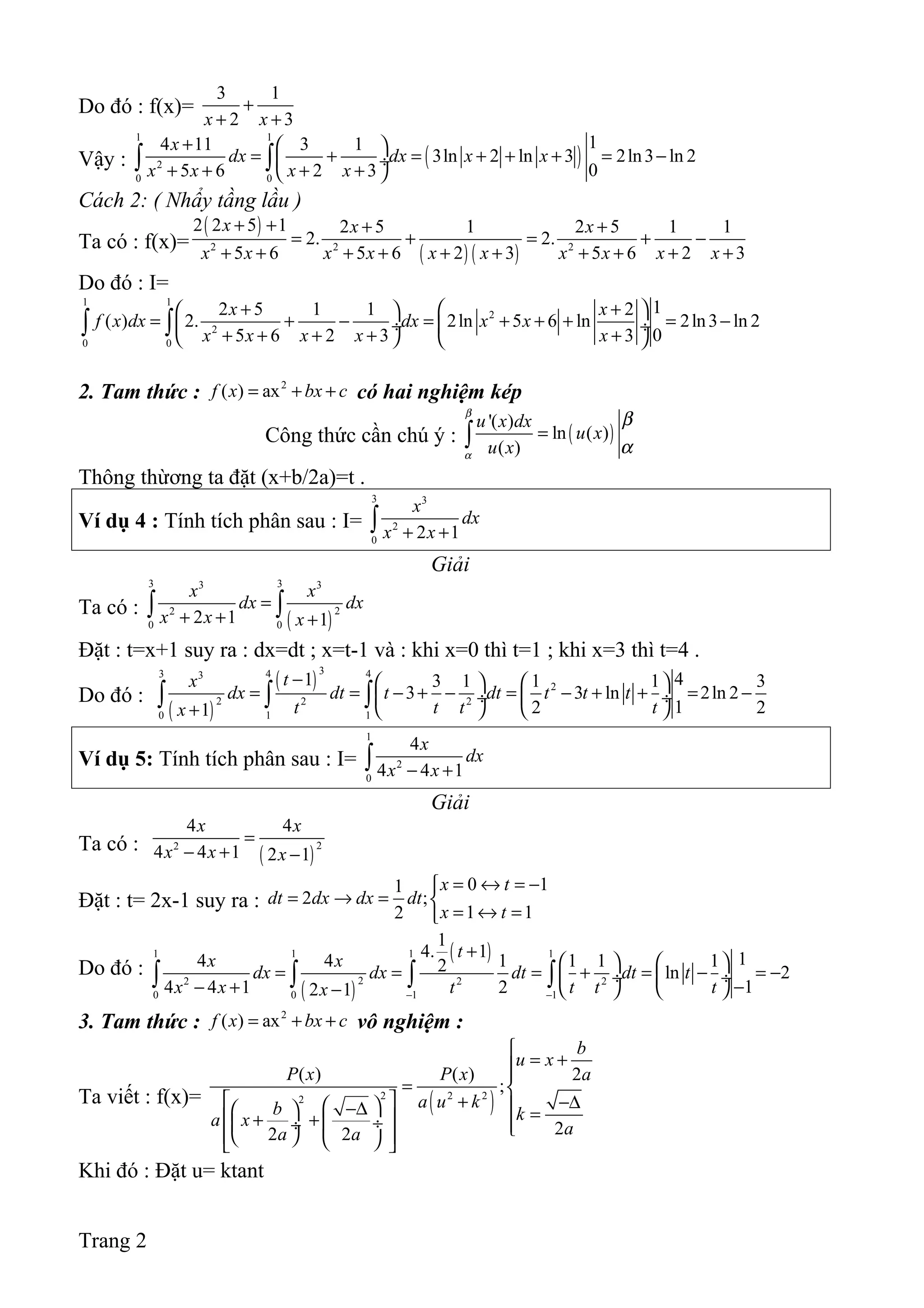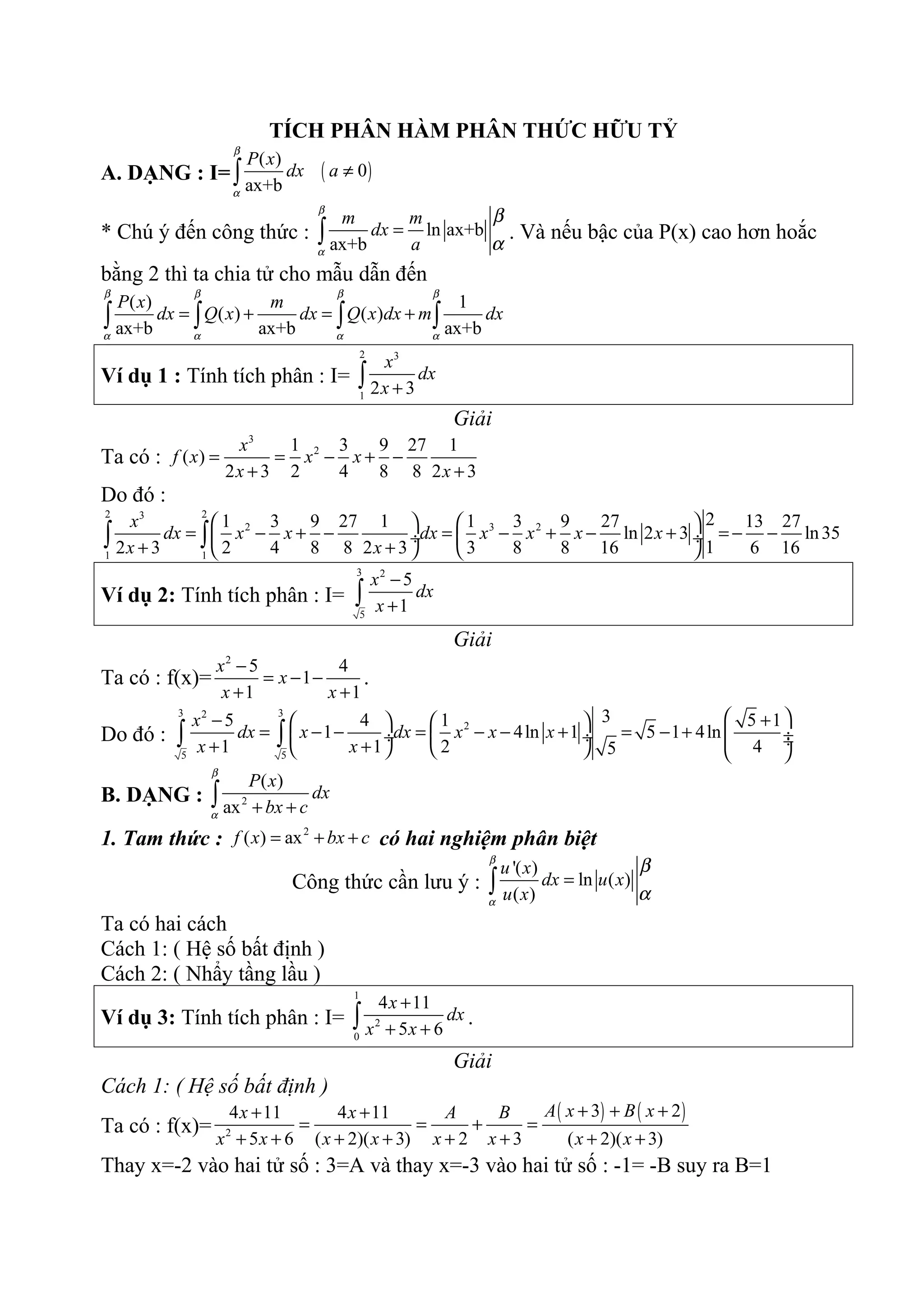 Tài liệu đề cập đến các phương pháp tích phân cho hàm phân thức hữu tỷ, bao gồm các dạng tích phân khác nhau và cách giải chúng thông qua các ví dụ cụ thể. Nó cung cấp công thức quan trọng và ứng dụng của chúng để tính toán các tích phân phức tạp hơn. Ví dụ, tài liệu trình bày các phương pháp như hệ số bất định và nhảy tầng lầu để giải quyết các tích phân hiệu quả.