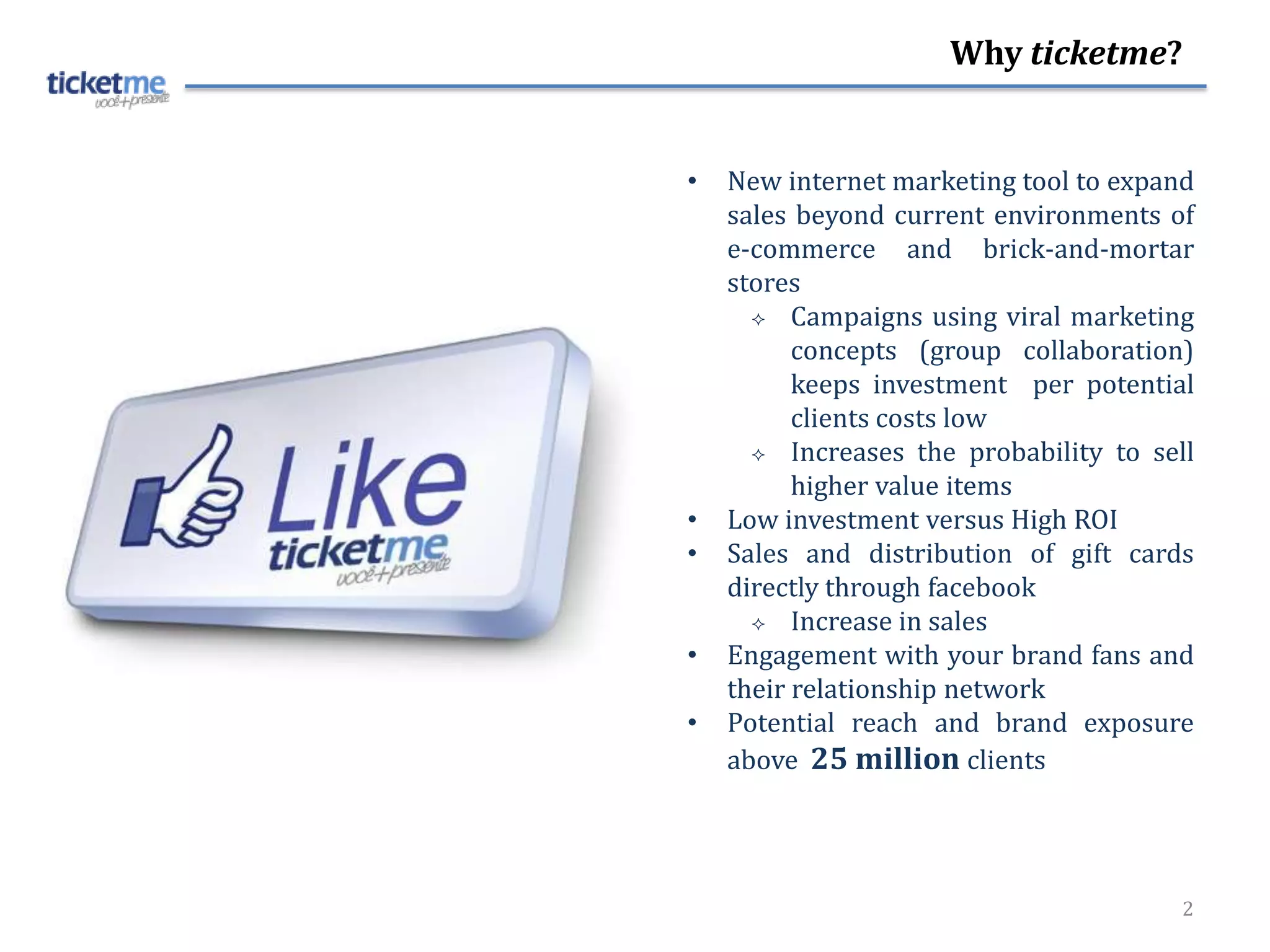 TicketMe is a new tool for social media engagement, focusing on gift card sales to enhance brand exposure and customer interaction on platforms like Facebook. The service aims to simplify the gifting process, allowing users to send gift cards while helping businesses execute low-cost marketing campaigns that reach millions. By fostering social connections through gifting, TicketMe enables easier gift selection and enhances customer loyalty for participating brands.