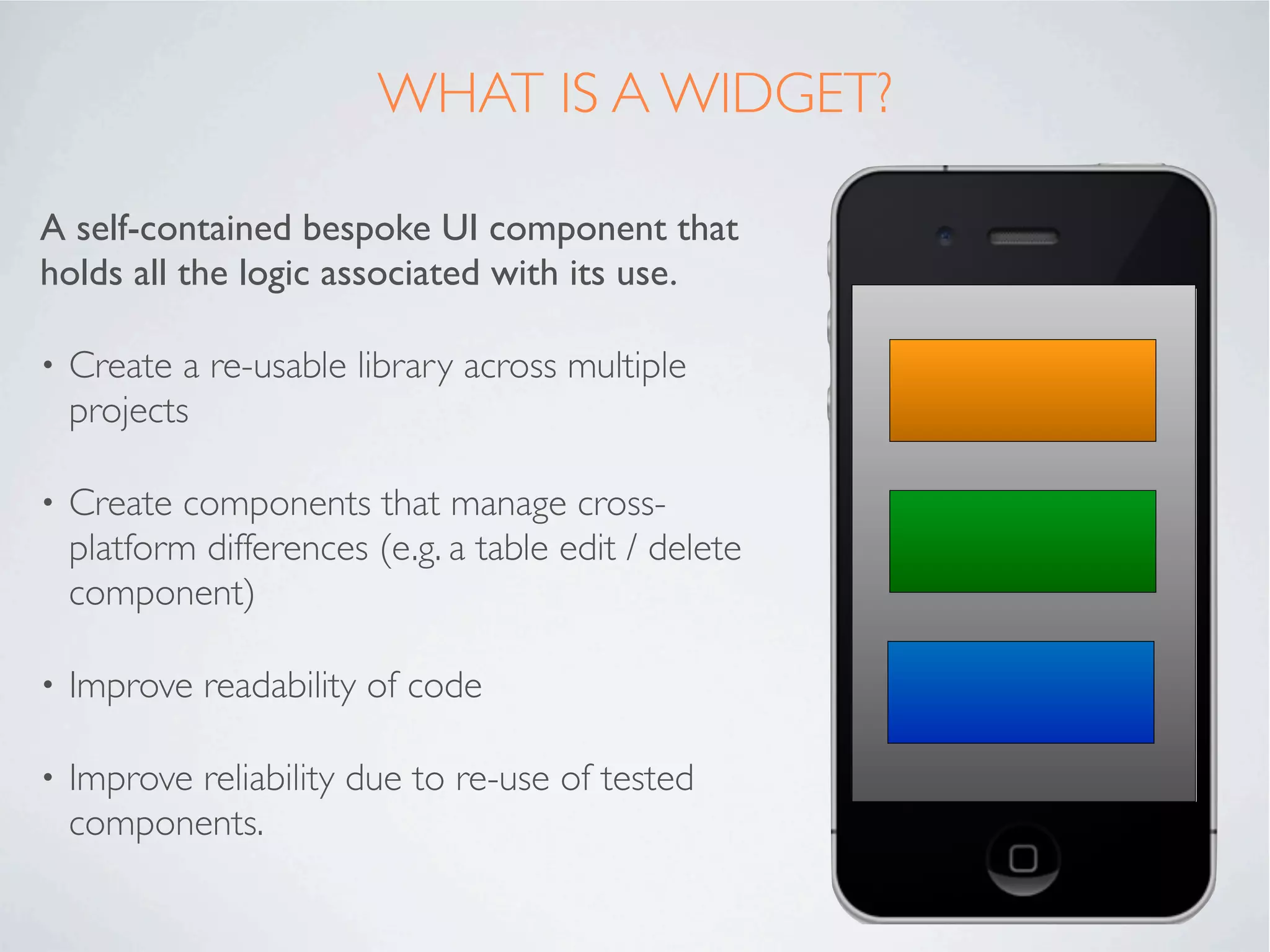 The document discusses Alloy Widgets, which are self-contained UI components that encapsulate logic and can be reused across projects. It provides an example of creating a custom table view widget that manages cross-platform differences. The widget file structure is described, and it is shown how widgets can be used in a main app via the Require tag, passing parameters that can be accessed in the widget controller. Styling of widget elements is recommended to be done in the main app for reusability.