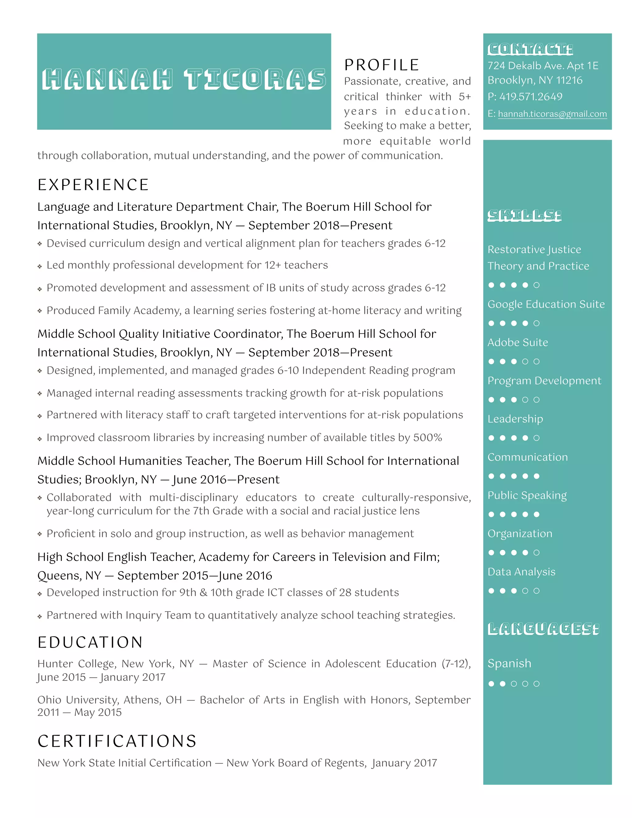 This document is a resume for Hannah Ticoras, who has over 5 years of experience in education. She is currently the Language and Literature Department Chair and Middle School Quality Initiative Coordinator at The Boerum Hill School for International Studies in Brooklyn, NY. Previously, she was a Middle School Humanities Teacher and High School English Teacher. Hannah holds a Master's degree in Adolescent Education from Hunter College and a Bachelor's degree in English from Ohio University. She is passionate about making a more equitable world through collaboration and communication.