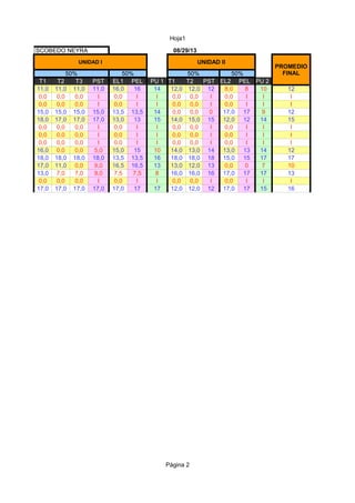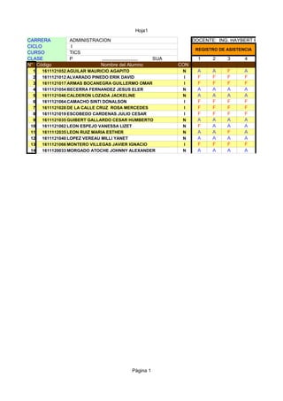 This document contains a registration of attendance for a TICS (presumably technology or computing) course. It lists 14 students with their codes, names, and attendance for each class session. It also includes tables showing the students' grades on tests, projects, and exams for two course units, along with their final grades and whether they passed or failed.