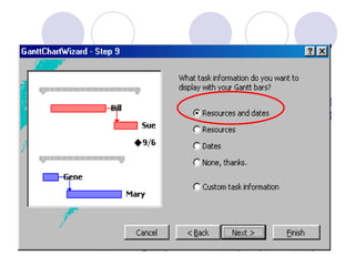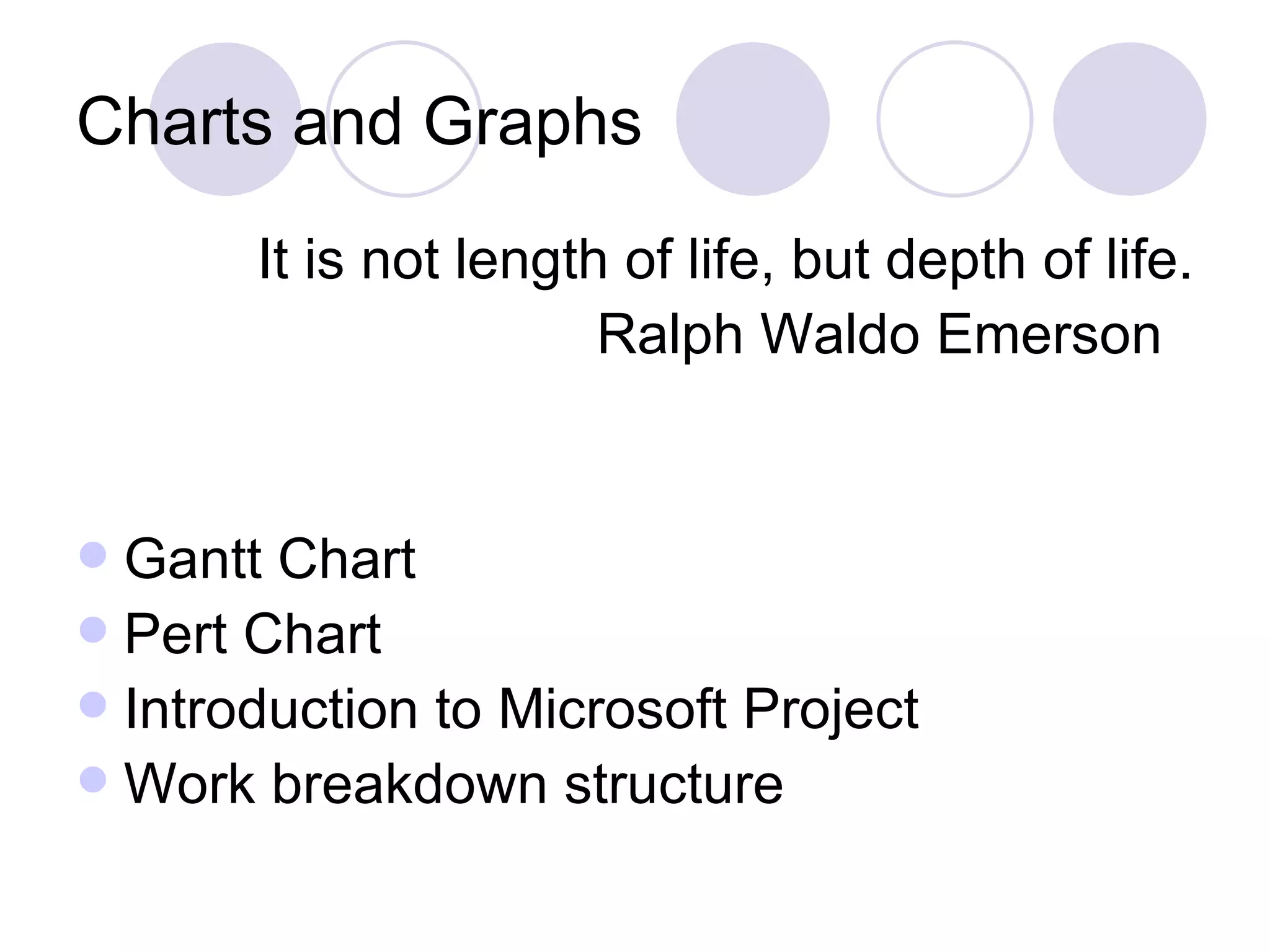 - The document discusses various charts used for project management including Gantt charts, PERT charts, and work breakdown structures.