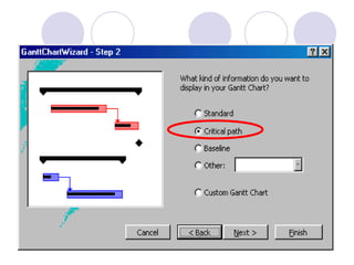 - Gantt charts show the duration of tasks visually on a timeline and are useful for planning, scheduling, and monitoring project progress. PERT charts model the dependencies between tasks through network diagrams.