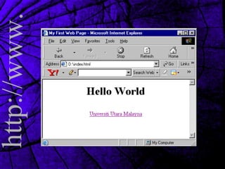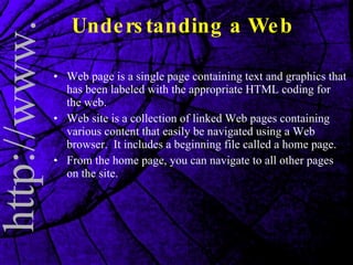 - Common terms used on the web such as URLs, HTTP, HTML, and web servers.