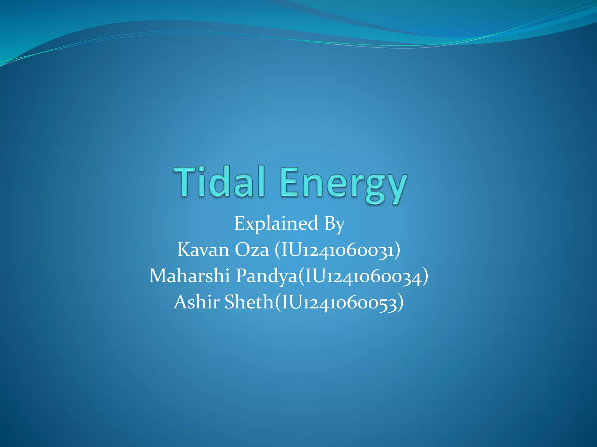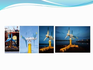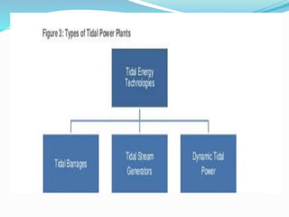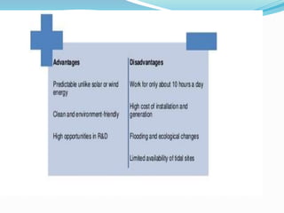 The document discusses tidal energy, which is generated from the gravitational forces of the moon affecting ocean tides, leading to power generation through tidal stream generators and tidal barrages. It emphasizes the potential for tidal energy in India, particularly in the Gulf of Kutch and Gulf of Cambay, where significant projects have been proposed, though many face challenges due to high costs. Despite the reliability and predictability of tidal energy, commercial viability remains limited, and ongoing projects have encountered financial setbacks.