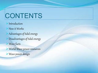 The document discusses tidal and wave energy, detailing their history, advantages, and disadvantages as renewable energy sources. It provides insights on how tidal power plants operate and highlights issues such as high costs and environmental impacts. Additionally, it covers wave energy resources, technologies, and the potential for harnessing ocean energy compared to other sources.