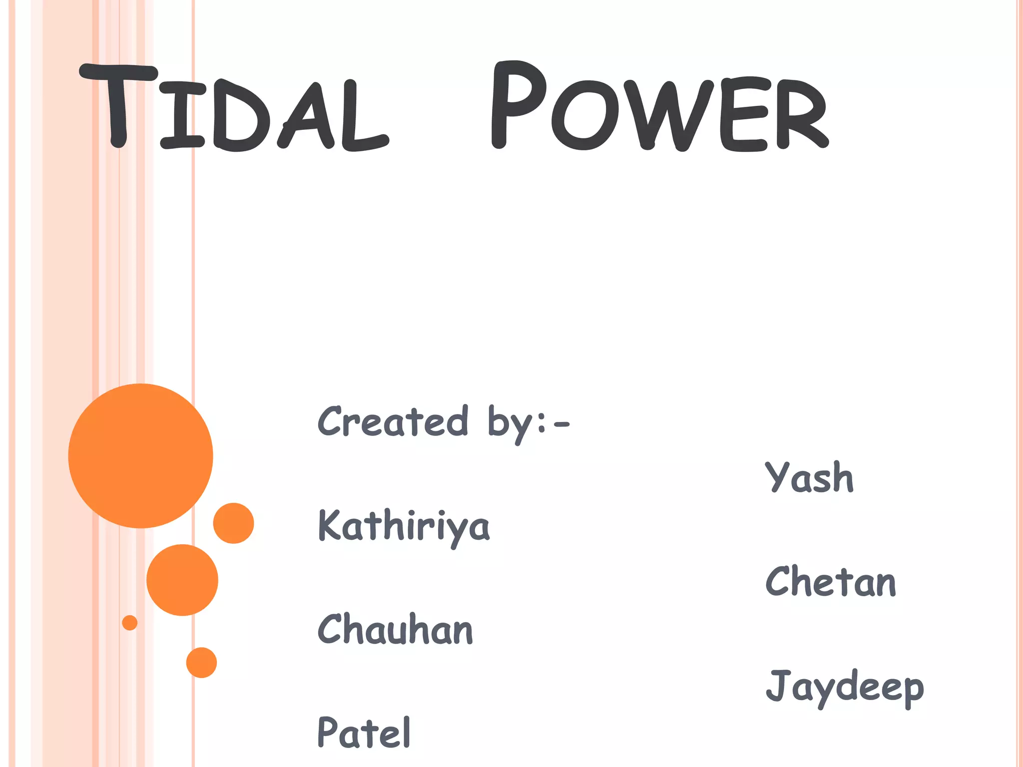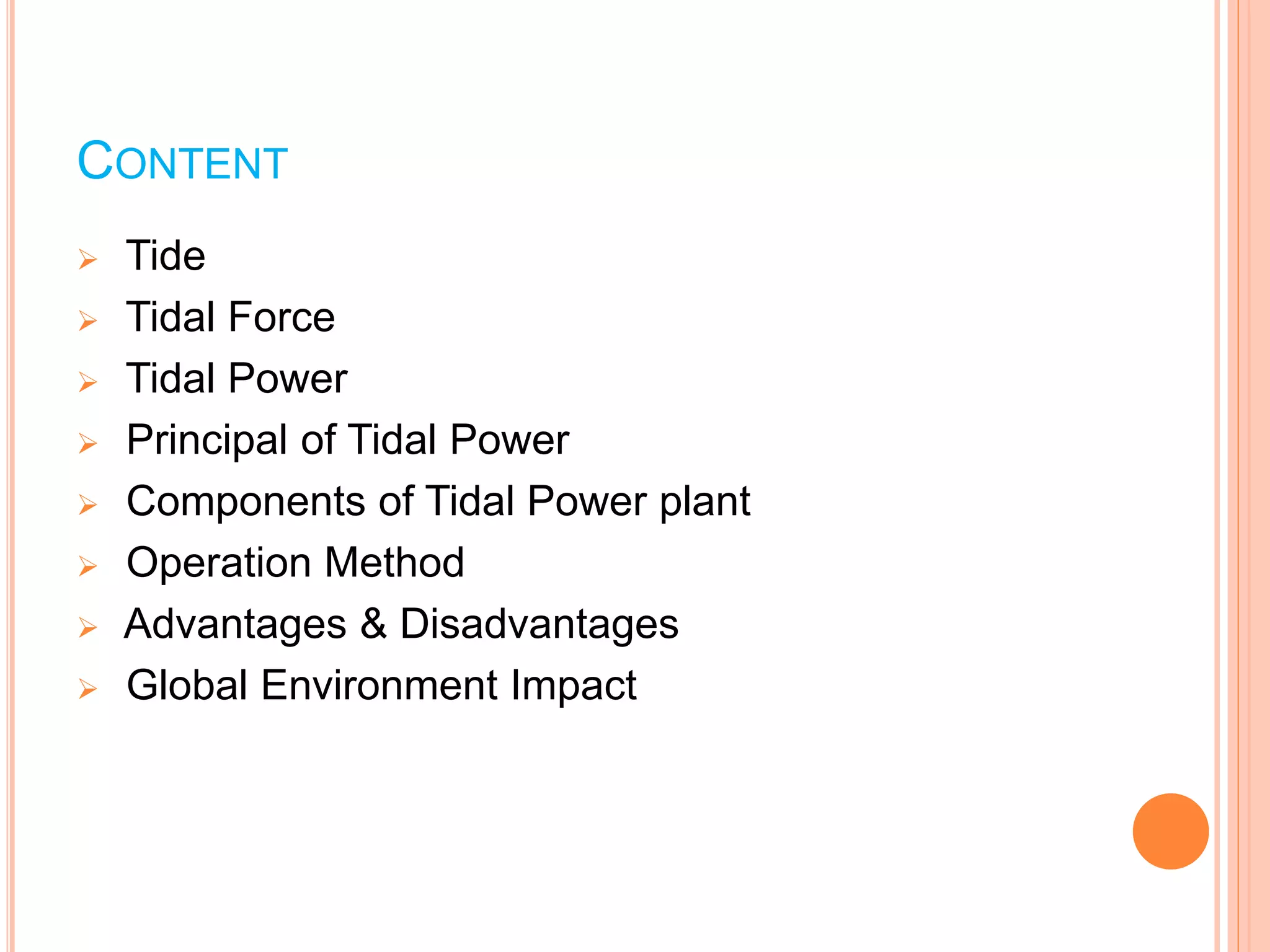 The document discusses tidal power, which harnesses the energy from the ocean's tides caused by gravitational forces of the moon and sun. It details the principles, operation methods, components of tidal power plants, and highlights its advantages such as predictability and low emissions, alongside disadvantages including high costs and ecological impact. Tidal power is presented as a promising alternative energy source with potential benefits for reducing reliance on fossil fuels.
