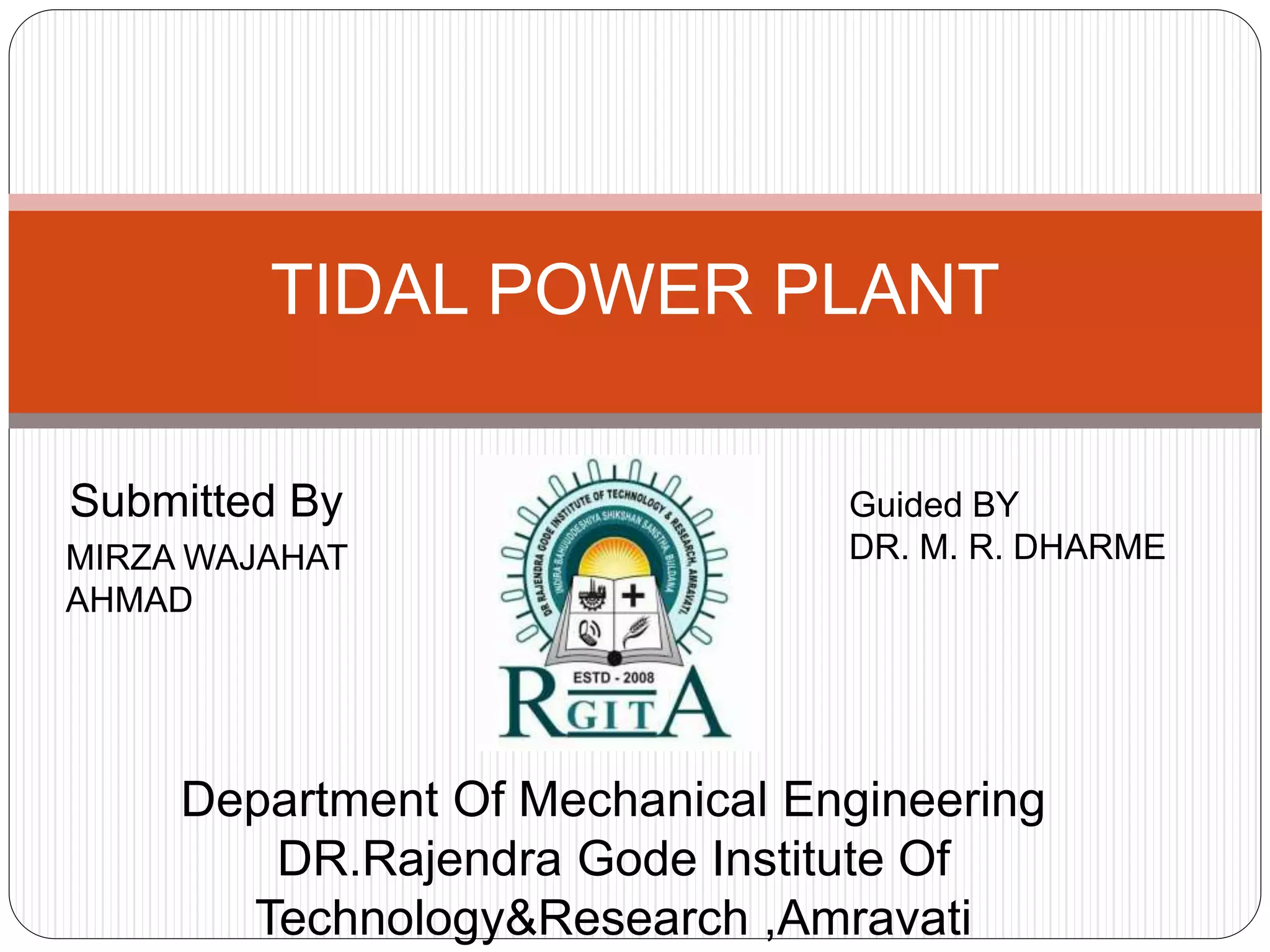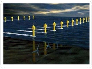 This document discusses tidal power and provides details about how it works. It describes two types of tidal power facilities: tidal barrages and tidal current turbines. Tidal barrages utilize potential energy by building dams across estuaries and bays, while tidal current turbines capture the kinetic energy of moving water using underwater turbines similar to wind turbines. The document outlines some of the first tidal power plants built, including one in France from 1960-1966, and provides advantages like predictability and efficiency, and disadvantages like high construction costs and potential environmental impacts.