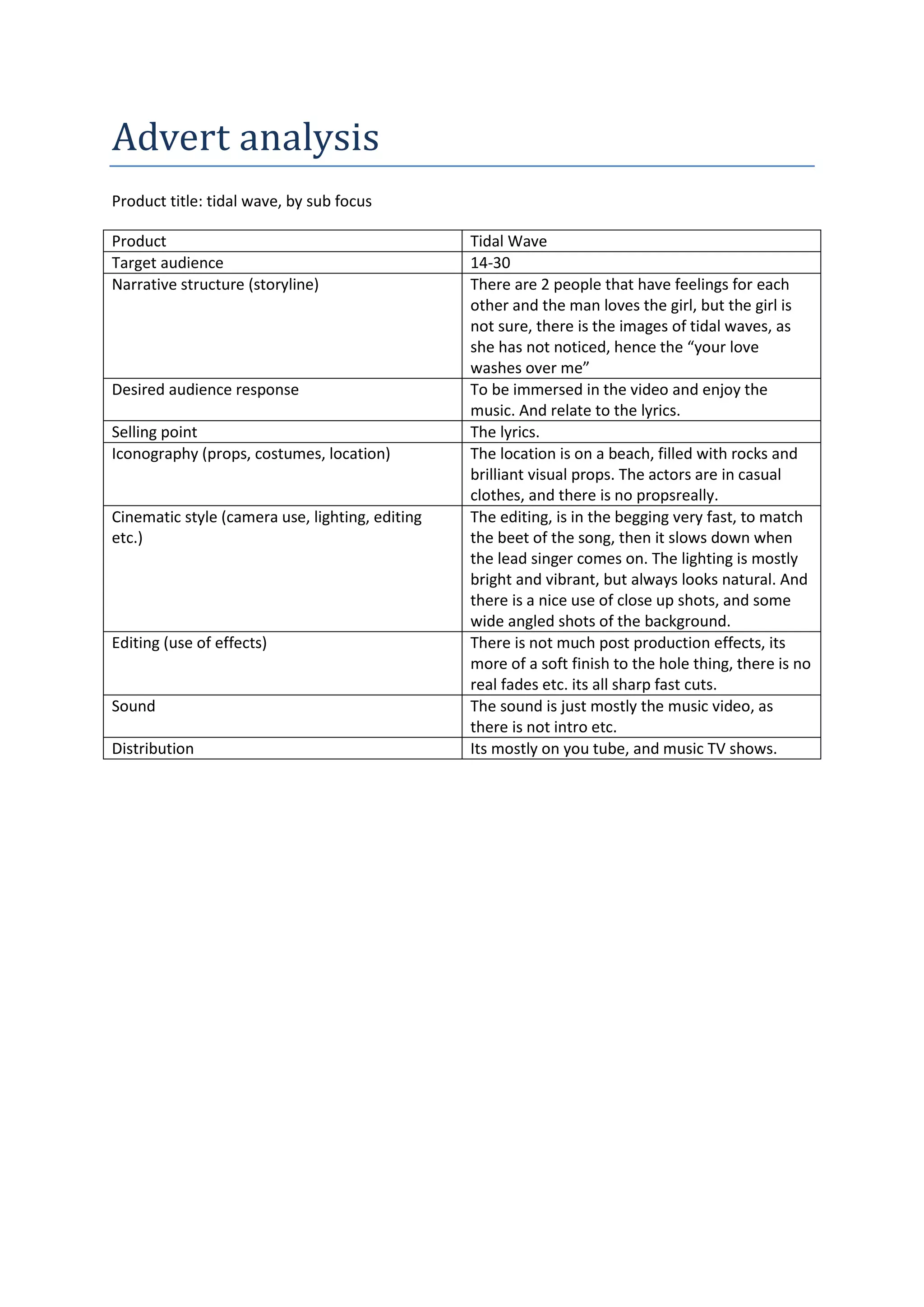 The music video is for the song "Tidal Wave" by Sub Focus. It targets an audience aged 14-30. The narrative follows two people who have feelings for each other but the girl is unsure as the man's love "washes over her" like tidal waves. The video aims to immerse viewers in the music and relate to the lyrics. It was filmed on a beach with casual clothing and natural lighting that brightens during close-ups and wide shots of the background. Editing uses sharp, fast cuts without effects. The sound is just the music and there are no introductions. Distribution is primarily on YouTube and music television shows.
