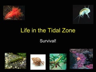 This document discusses the tidal zone and the adaptations required for organisms to survive within it. The tidal zone is divided into four zones - splash zone, high tide zone, middle tide zone, and low tide zone - based on how often each is covered by water. Organisms in each zone have adapted in ways such as avoiding desiccation, resisting waves, and protecting themselves from predators in order to survive the varying environmental conditions caused by the tides. Examples of adaptations include barnacles fitting tightly to rocks and sea stars using tube feet to anchor themselves.