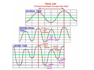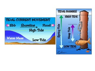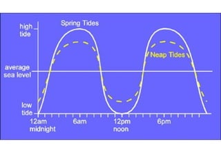The moon has a greater tidal effect than the sun. The Bay of Fundy has the greatest tidal range in the world, with tides over 50 feet. A neap tide occurs during the first and third quarter moon phases and produces more moderate tides. A tidal bore is created when an incoming high tide forms a wall of water that moves upriver in some low-lying rivers.