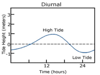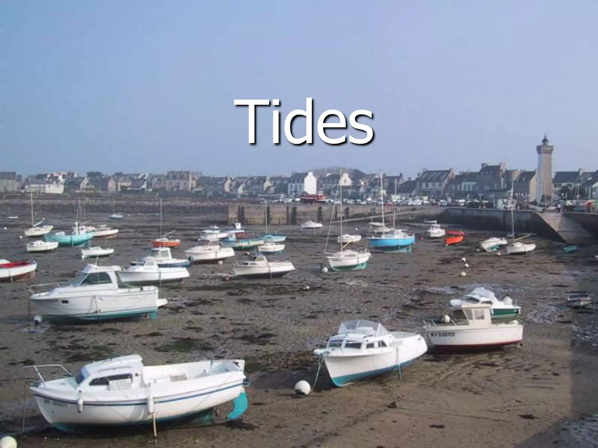 Tides are caused by the gravitational pull of the moon and sun on the Earth's oceans. This creates bulges of water on opposite sides of the Earth that result in regular rises and falls of sea level called tides. The moon has a stronger influence than the sun due to its closer proximity. Tides are strongest in coastal areas and weakest in the open ocean. There are typically two high tides and two low tides each day, known as semidiurnal tides, though some locations only experience one of each, called diurnal tides.
