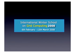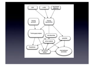 This document discusses training and technology transfer experiences from a European Union perspective in the Asia-Pacific region. It describes the NeSC Training, Outreach and Education projects which have provided training courses worldwide since 2004. Barriers to and enablers of technology adoption are examined based on interviews with researchers. Examples of interventions to address barriers include targeted events, introductory materials, and 'eRoadshows' to disseminate information directly to communities. A model for an online International Winter School for Grid Computing is presented as an example of leveraging resources and services to replicate an in-person training program.