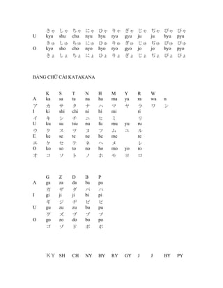Tài liệu trình bày bảng chữ cái hiragana và katakana cùng với các câu giao tiếp cơ bản trong tiếng Nhật. Nó cũng bao gồm hướng dẫn về cách đếm số, đếm thời gian, và các đơn vị đếm khác nhau như người, cái, và ngày. Tài liệu là nguồn tài liệu học tập hữu ích cho những ai muốn làm quen với tiếng Nhật.