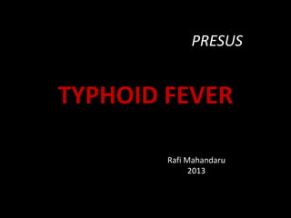 Dokumen tersebut membahas tentang kasus demam tifoid pada pasien berusia 10 tahun. Terdapat gejala klinis seperti demam, nyeri perut, mual dan muntah. Diagnosis kerja adalah demam tifoid berdasarkan hasil pemeriksaan fisik dan laboratorium. Pasien mendapatkan terapi antibiotik dan antipyretik serta pemantauan perkembangan penyakitnya.