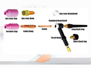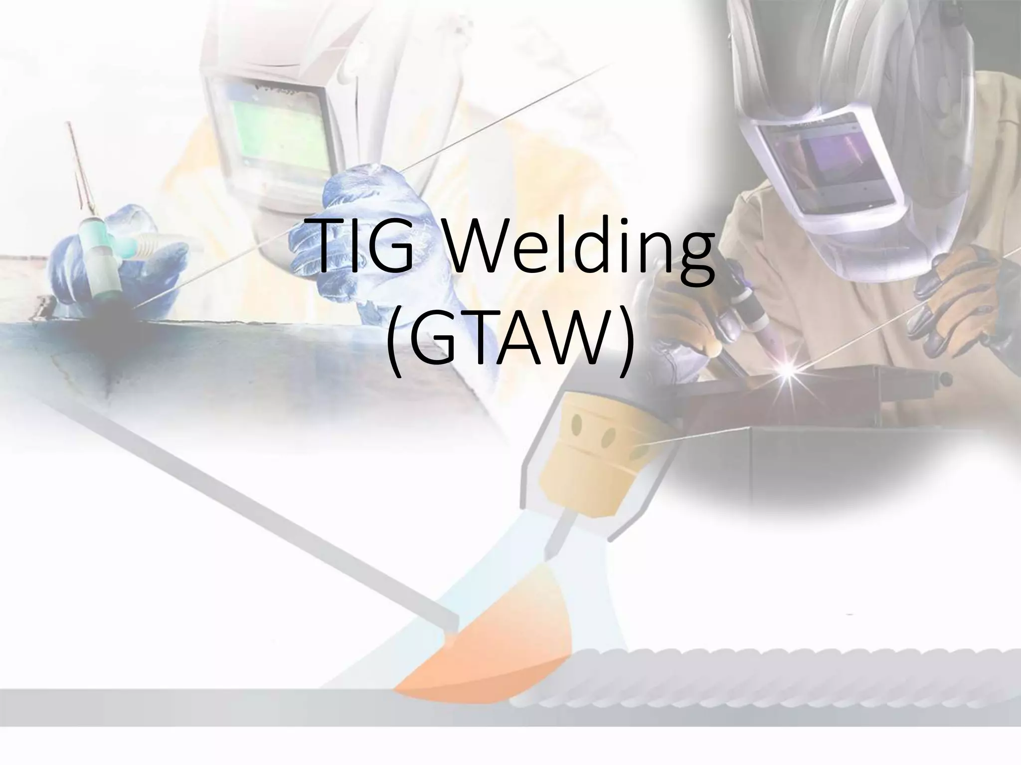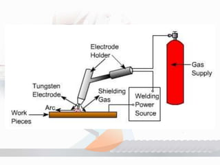 TIG welding, or Gas Tungsten Arc Welding (GTAW), uses a non-consumable tungsten electrode to melt and bind metals with the aid of an inert shielding gas to prevent contamination. The process requires heat, shielding, and filler metal, with a focus on precise control and cleanliness, making it suitable for welding thin sections of various metals. While it produces high-quality welds, it is slower and more expensive compared to other welding processes.