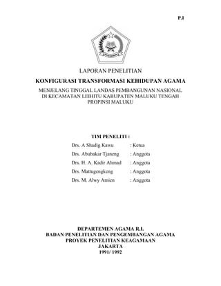 Laporan ini menyajikan hasil penelitian mengenai konfigurasi dan transformasi kehidupan agama di beberapa daerah menjelang pembangunan nasional. Penelitian dilakukan oleh tim-tim peneliti di berbagai lokasi seperti Kecamatan Leihitu Maluku Tengah, Kabupaten Probolinggo Jawa Timur, Propinsi Bali, Kecamatan Kretek Bantul DIY, Kecamatan Paiton Probolinggo, Kelurahan Lamaru Kecamatan Balikpapan Timur,