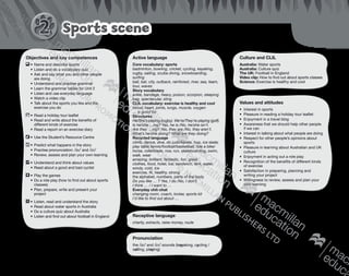 This document contains the objectives and materials for two English language lessons. The first lesson introduces students to different sports through vocabulary presentation, listening activities, and a vocabulary quiz. Students ask and answer questions about sports they like and learn about popular sports in Australia. The second lesson has students read a holiday tour leaflet, answer true/false questions, write their own city tour, and listen and complete a conversation about activities. The lessons aim to develop students' English skills through sports and travel topics.