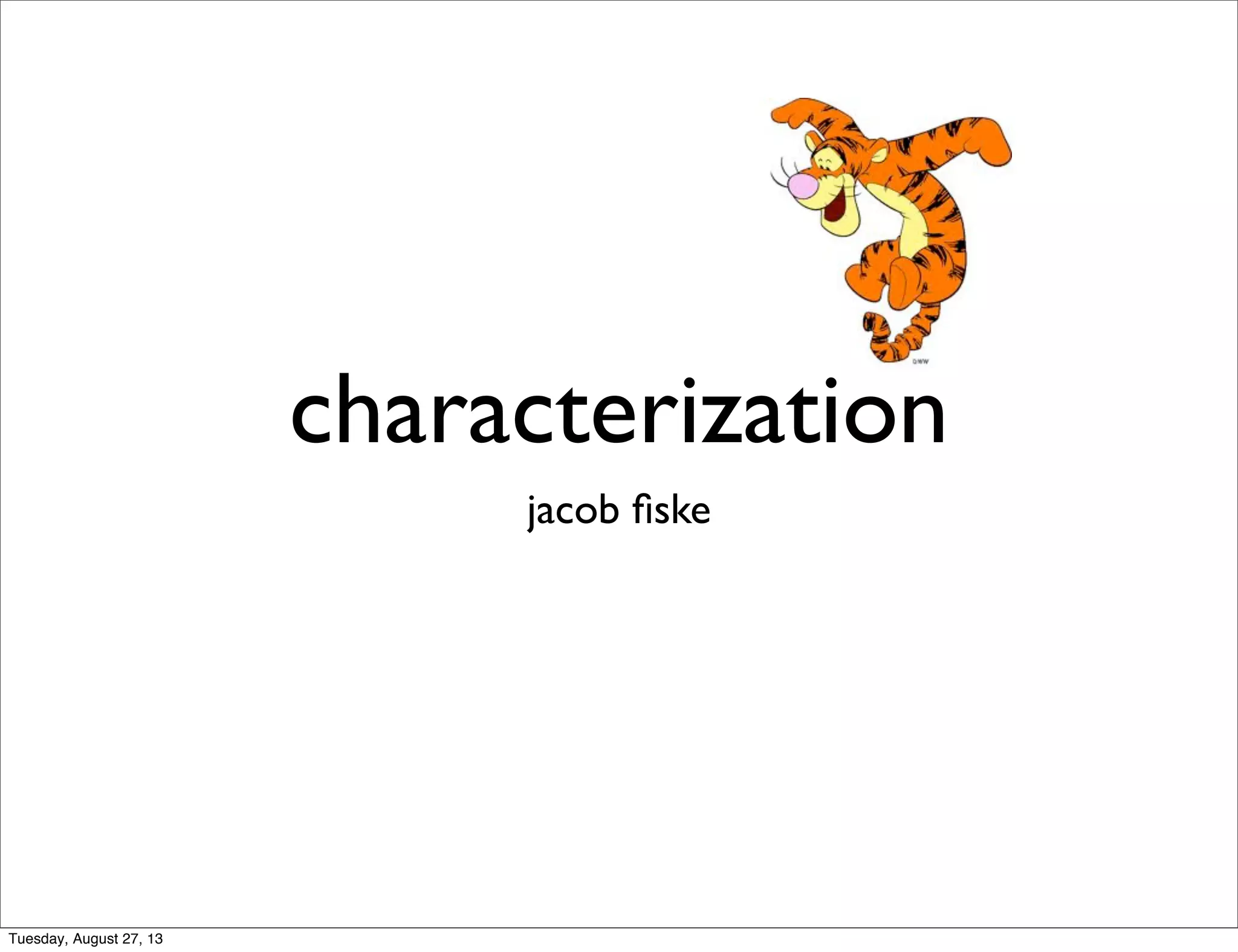 The document describes Tigger from Winnie the Pooh. It notes that Tigger is orange and black with stripes, bounces on his tail, lives with Winnie the Pooh, helps Pooh get honey, thinks "a tigger's a wonderful thing" and "bouncing is what tiggers do", says "bouncing's a wonderful thing" and "bouncing's what tiggers do best", and others think he is awesome, crazy, and "a tigger".
