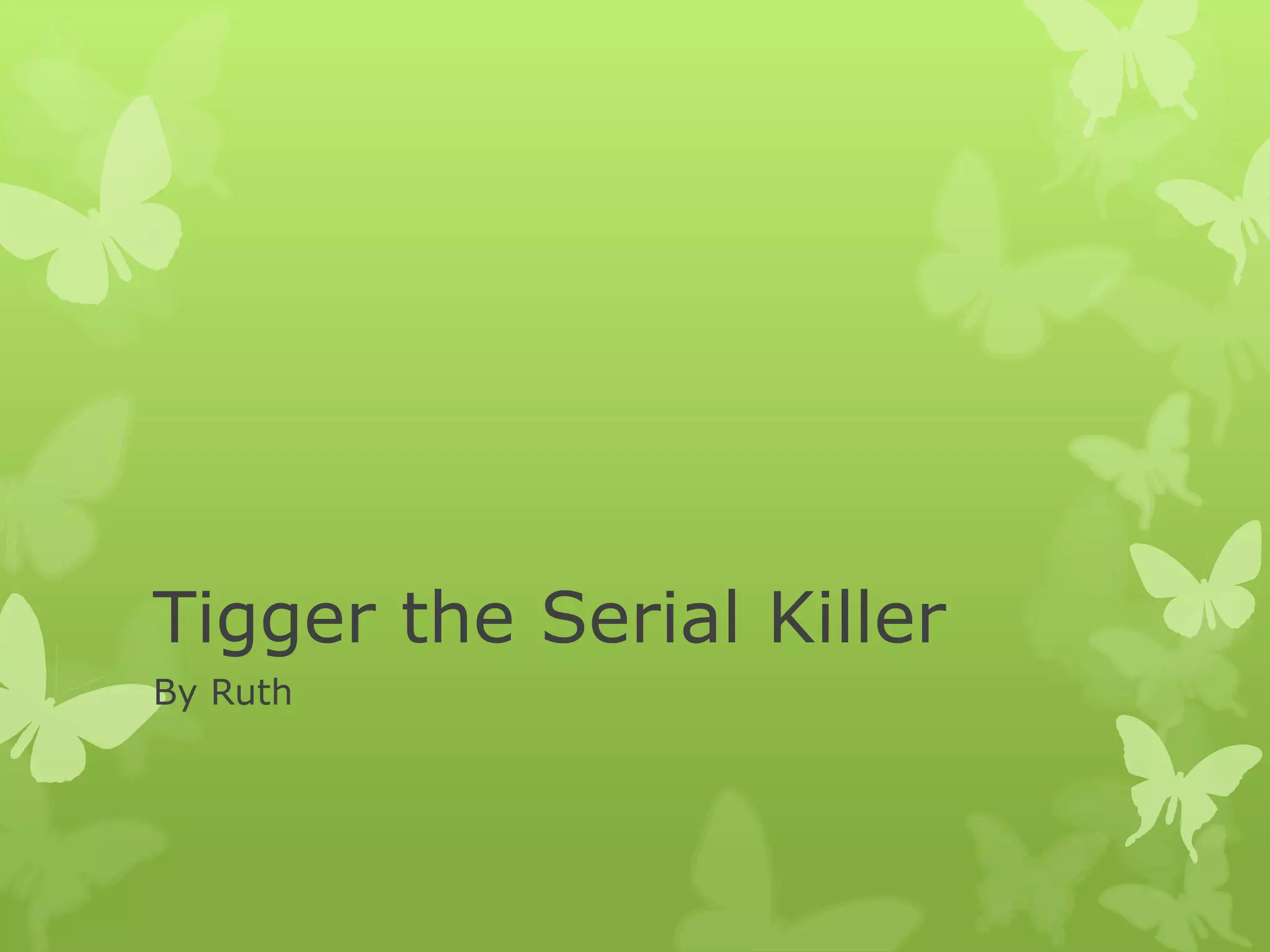 Tigger the cat has killed various animals including birds, rats, and baby bunnies, making him a serial killer in animal form. However, the document clarifies that Tigger is just a cat and the killings were likely natural predatory behaviors rather than malicious acts. The writing style shifts between stating Tigger is a killer and clarifying it is joking, leaving the seriousness of the claims ambiguous.