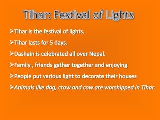 Tihar is a 5-day Hindu festival celebrated in Nepal and parts of India. The first day honors crows, with people leaving food offerings on their rooftops. The second day honors dogs as loyal companions. On the third day, cows are worshipped as symbols of wealth and prosperity and the goddess Lakshmi, and homes are cleaned. The fourth day involves worshipping oxen for their hard work and constructing cow dung hills. The fifth and final day is Bhai Tika, when sisters place colorful tikas on their brothers' foreheads for long life and visit temples without siblings.