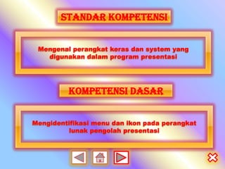 Standar kompetensi dan kompetensi dasar mengenai pengenalan perangkat keras dan sistem program presentasi Microsoft PowerPoint 2007, termasuk menu, ikon, dan fungsi tool-toolnya seperti menyimpan, membuka, dan menutup presentasi.