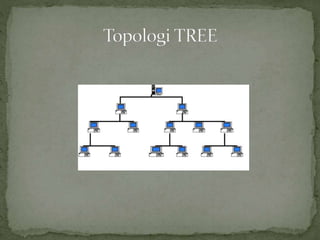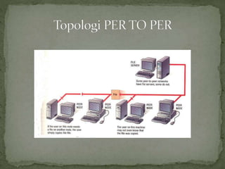 Dokumen tersebut membahas tentang kelebihan dan kekurangan jaringan peer to peer (PER TO PER) dan jaringan tree. Pada jaringan peer to peer, setiap komputer dapat berbagi sumber daya jaringan seperti harddisk dan printer secara murah. Akan tetapi, pemeliharaan dan keamanan jaringan lebih sulit dikelola karena terdistribusi pada setiap komputer. Sedangkan pada jaringan tree, setiap komputer hanya terhubung ke komputer di