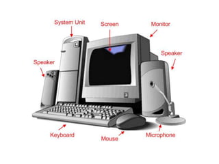 Dokumen ini menjelaskan pengertian dasar komputer yang berasal dari bahasa Latin 'computare', yang berarti alat hitung. Selain itu, dijelaskan juga bagian-bagian utama komputer seperti monitor, CPU, keyboard, mouse, printer, speaker, scanner, dan jenis memori seperti RAM dan ROM.