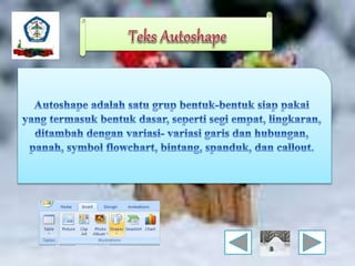 Dokumen tersebut membahas tentang penggunaan fitur-fitur Ms. PowerPoint 2007 untuk membuat tabel, grafik, dan diagram. Terdapat penjelasan tentang cara membuat tabel, grafik, dan diagram menggunakan perintah-perintah pada ribbon Ms. PowerPoint 2007.