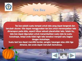 · Tables, perintah untuk menambahkan table pada tampilan slide Anda.