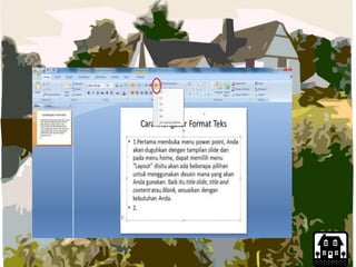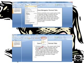 Dokumen ini memberikan panduan langkah demi langkah untuk membuat presentasi menggunakan Microsoft PowerPoint, termasuk cara membuat dokumen baru, mengganti layout slide, serta menambahkan teks, gambar, dan clipart. Panduan ini juga menjelaskan bagaimana mengatur format teks dan tema presentasi. Informasi yang disampaikan bertujuan untuk membantu pengguna dalam membuat presentasi yang menarik dan informatif.