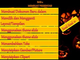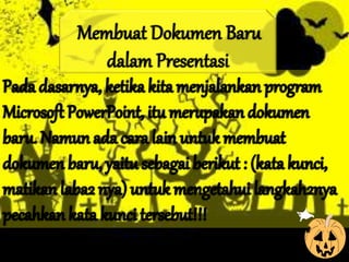 Dokumen tersebut memberikan instruksi langkah demi langkah untuk membuat presentasi menggunakan Microsoft PowerPoint, meliputi cara memilih layout slide, menyisipkan teks, gambar, dan objek, serta mengatur format teks, warna, dan animasi.