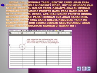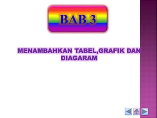 Dokumen tersebut memberikan instruksi tentang penggunaan tabel, grafik, dan diagram dalam Microsoft Word. Mencakup cara menambahkan dan mengedit tabel dengan mengatur jumlah kolom dan baris, menggabungkan sel, serta menyisipkan berbagai jenis grafik seperti diagram garis, batang, dan lingkaran beserta langkah-langkahnya. Terdapat pula soal evaluasi untuk menguji pemahaman tentang fitur-fitur tersebut.