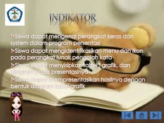 Dokumen ini memberikan panduan langkah demi langkah tentang cara membuat grafik dan diagram organisasi menggunakan Microsoft PowerPoint, mencakup cara menginsert chart, membuat smartart, dan menambahkan bentuk. Selain itu, terdapat evaluasi untuk menguji pemahaman mengenai objek-objek yang dapat digunakan dalam presentasi. Beberapa fungsi penting dari objek seperti WordArt, textbox, dan autoshape juga dijelaskan.