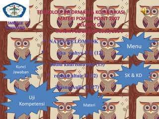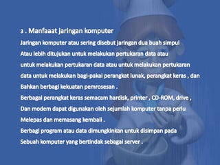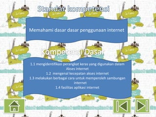 Dokumen tersebut membahas perangkat keras yang digunakan untuk mengakses internet, termasuk komputer, modem, router, hub, saluran telepon, switch, NIC, bridge, dan webcam. Juga dibahas cara-cara menghubungkan komputer ke internet seperti menggunakan hubungan peer-to-peer, koneksi USB dan ethernet pada modem, active hub, dan wireless router.