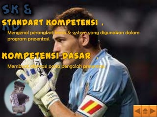 Dokumen tersebut memberikan penjelasan tentang penggunaan program presentasi PowerPoint untuk membuat presentasi, termasuk cara menambahkan animasi, mengatur transisi slide, menambahkan hyperlink, file video dan suara, serta cara mempresentasikan hasil presentasi.